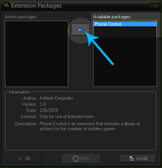 Ahora el nombre de la extensión se moverá a la parte izquierda, la cual es el área de los paquetes activos en tu proyecto. Puedes hacer clic en el botón que dice "OK" y para un mejor funcionamiento de la extensión es recomendable reiniciar Game Maker:Studio. Luego puedes abrir cualquier objeto y una nueva pestaña llamada "Phone Control" debería estar incluida en la parte derecha de las acciones.